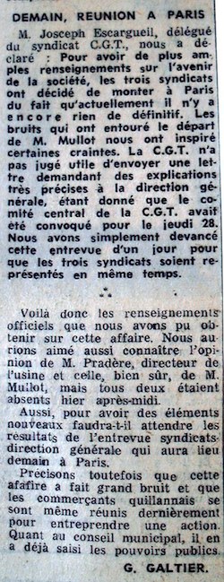Fin janvier 1970,Monsieur Paul MULLOT,Maire de QUILLAN ,Président de l' USQE ,Directeur Général de la S.A.FORMICA,adjoint de Monsieur de SAINTE-CROIX , Président Directeur Général de la S.A.FORMICA ,annonce son départ de la société FORMICA.