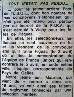 Pour Maurice PONT ,notre jeune arrière, après quelques rebondissements,la sélectiion .L'essentiel était d'y etre ,et à son avantage encore !
